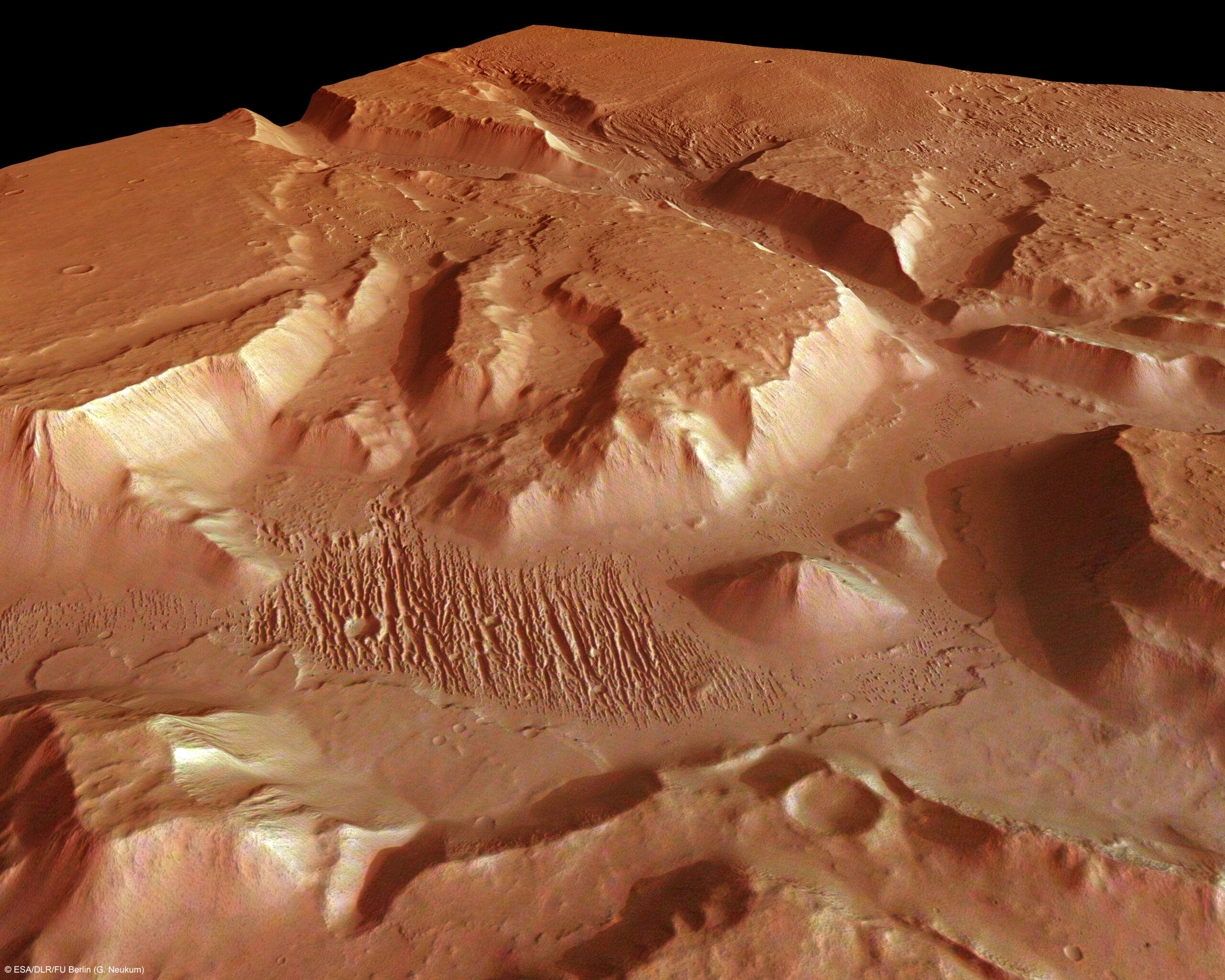 A new image taken by ESA’s Mars Express spacecraft shows the Aeolis Mensae region on Mars, an area known to be on a tectonic transition zone which separates the southern highlands and the northern lowlands. The area is nearby the volcanic region of Elysium.