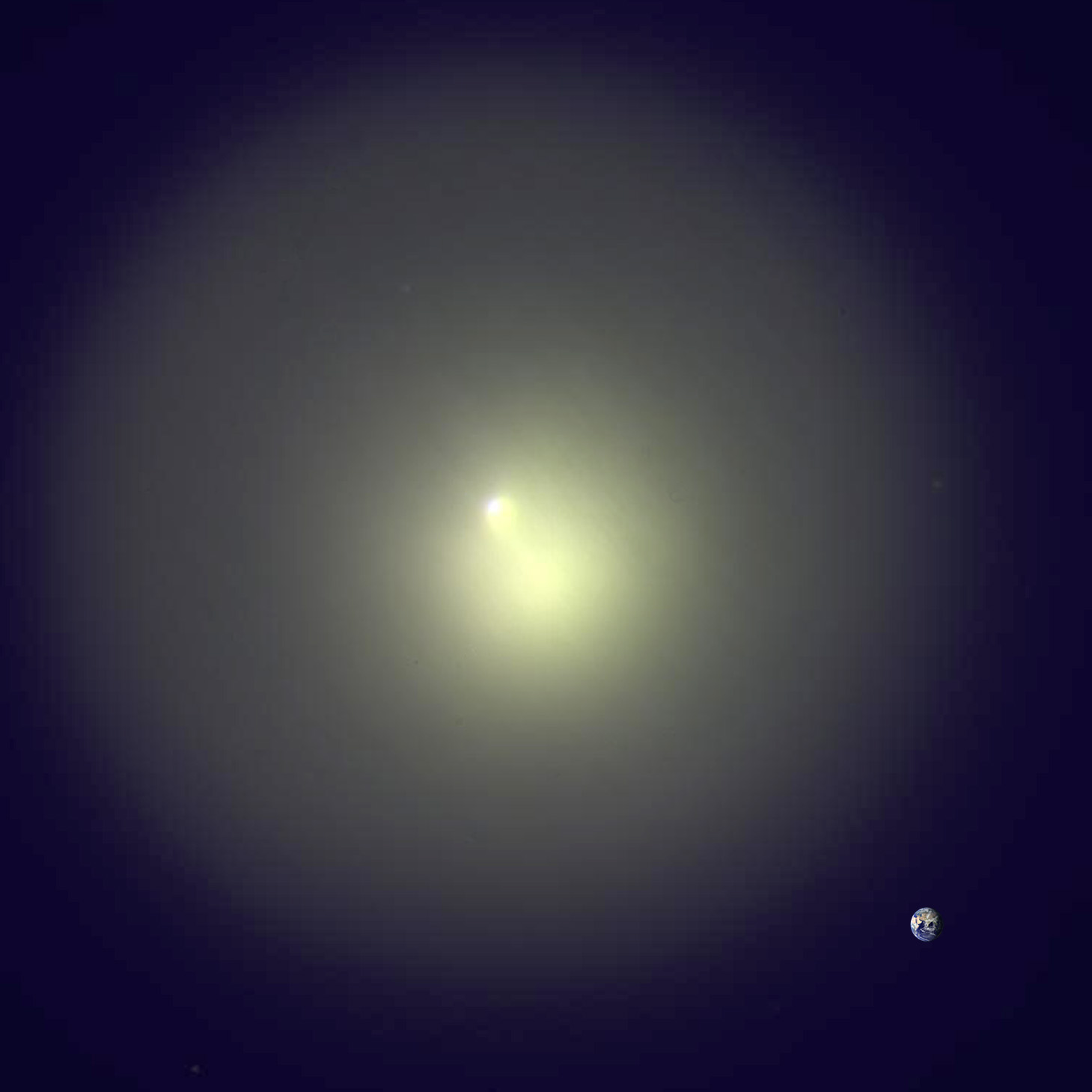 Enhanced picture of Comet Holmes to show the expanding cloud of dust from the outburst more clearly. The Earth is shown to scale at the lower right.