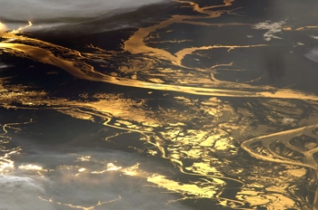 Die untergehende Sonne verwandelt den Amazonas und einige seiner Nebenflüsse in Ströme aus Gold. Rund tausend Kilometer von der Küste entfernt, schlängelt sich der Fluss in diesem rund 150 Kilometer umfassenden Bildausschnitt ostwärts. Die schimmernden Flächen zwischen dem Amazonas in der Bildmitte und dem Madeira River am unteren Bildrand sind ausgedehnte sumpfige Feuchtgebiete. Oberhalb des Amazonas fließt der Uatumã River seiner Mündung entgegen. Die Aufnahme stammt von den Astronauten an Bord der Internationalen Raumstation und wurde am 19. August 2008 gemacht.