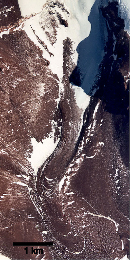 Satellitenfoto eines mit einer Staub- und Gesteinsschicht bedeckten Gletschers in der Antarktis